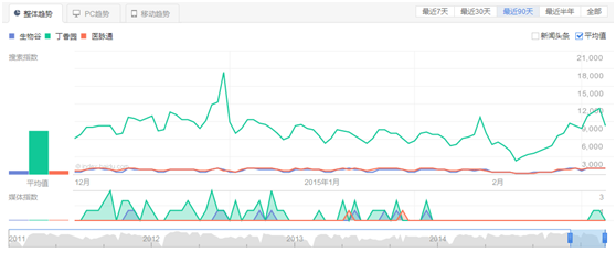 我们可以看到,与网站流量情况差不多,丁香园的百度指数比医脉通和生物谷高一个数量级,而生物谷和医脉通基本上是“双胞胎”的状态,一直比较平稳。