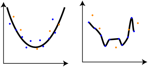 据),吻合度也还不错。图九右边的曲线则完全通过了每一蓝点,吻合度极高,完全描述了蓝点的复杂特性。然而,它在描述黄点时,吻合度就差多了,偏差就比左