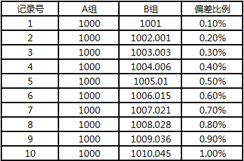 这样B组第一个记录包含偏差为1.001=1.0011.B组第一个值为1000×1.001=1001. B组第二个记录包含偏差为1.002001=1.0012.B组第一个值为1000×1.002001=1002.001. B组第十个值为1000×1.01004512=1010.045.这样如果是小数据n=10, A组数据其实和B组数据比起来相差是不大的。B组内的每一个数字增加的偏差不足以引起注意,如果2%以内的偏差都可以接受的话。