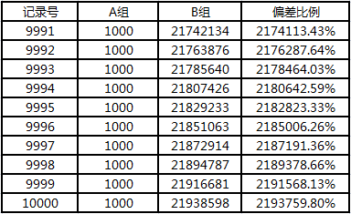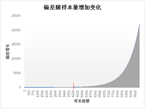 A组数据和B组数据,在拥有海量的数据样本的情况下,相差已是十万八千里了。图十显示了偏差随样本量增加的变化情况。在样本数量为4236左右,偏差的增加还不明显。一过4236,偏差则出现了惊人的增长。