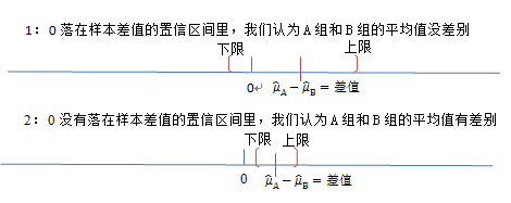 但我们已经知道由于样本均分差的存在,样本平均值相减的差值不一定是零,而且这个差值有一定的置信区间。那么我们实际上更精确的说是看0是否落在样本差值的置信区间内(置信区间的上限和下限和上面提到的第一统计错误率是相一致的,有一个5%的概念在里面,这儿就不详细介绍了。反正是否落在置信区间里否也可以用来判断统计学上是有意义还是没有意义)。落在里面我们就说是统计学上是没有意义的也就是两组数据的平均值是一样。不落在里面我们就说是统计学上是有意义的也就是两组数据的平均值不一样。如图十一所示: