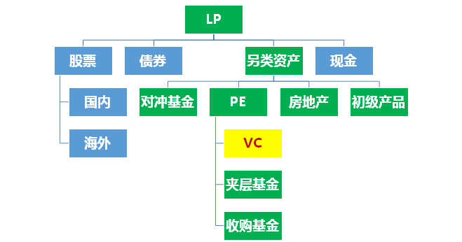 LP 会按照以上描述的资产类别来建立自己独特的资本分配策略。LP通常根据自己对风险,收益以及资本流通性的需求在每一个资产类别上分配不同的资本投入百分比。 PE 属于另类资产类别,而VC则属于PE下属的类别分支,所以,对大多数LP来说, VC只是他们投资组合的一小部分。如下图: