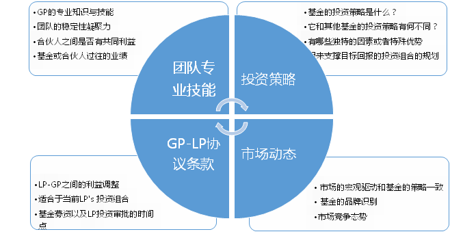 “业绩为王” 的重要性在业界是得到认可的,在一个针对LP投资标准的调查中发现,超过200家美国LP认可业绩的重要性。 LP通常用IRR (内部回报率)来衡量投资的业绩。其他的标准还包括业绩水平的一致性, LP的多样性,团队的专业知识和技能以及基金的投资策略。在“Beyond the JCurve” 这本书里提出了一个定性打分标准,这个标准将基金的管理团队和基金的投资策略作为最重要的两个因素: