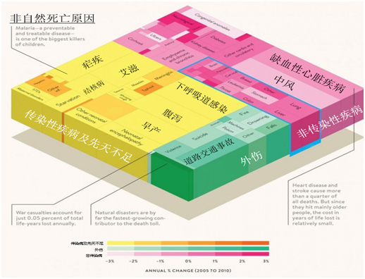 俗话说:“一图抵千言”(A picture isworth a thousand words)。 许多复杂的结果往往用一张图就能十分直观地展示出来,让人一看就明白。比如图一显示了2005 至2010年全球非自然死亡的比例分布图。所有的疾病被分为三大类:传染病及先天不足,受伤,以及非传染性疾病,分别用黄,绿,粉红三色代表。它们的体积反映了各类疾病在所有非自然死亡中所占的比重。由图可见,传染病及先天不足(黄色)所占比重几乎等同于非传染性疾病(粉红色),而传染病这一块完全可以通过公共卫生方面的努力加以缩小。图中每一大块颜色中同色系的小块代表了具体的疾病。同样的,体积反映所占的比重,而颜色深浅则体现了05年至10年平均年度变化的百分比,深色表示连年增长,而浅色表示连年下降。增长及下降的平均年度变化百分比没有大于3%的。小小一张图包含了许多信息,却又一目了然,实实在在地诠释了数据统计上的“一图抵千言”。