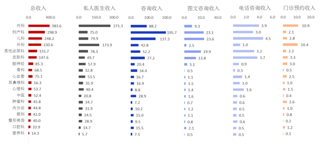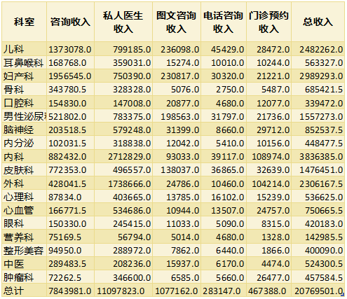 根据总收入对各个科室由高到低进行排序,以柱状图的形式分别列出了各科室总收入,私人医生收入,咨询收入,图文咨询收入,电话咨询收入及门诊预约收入,方便读者进行横向和纵向两个维度的对比。由于各类收入差距过大,无法使用同一尺度,因而在收入的下方标注了各列柱状图的尺度,并在柱子边上标注了实际收入的数值。这样,纵向对比各科室在每一种收入中所占比重可以直接看柱状的长短,而横向对比各科室不同收入构成时也可以结合尺度和实际数值迅速得出结论。例如,读者可以很容易发现内科总收入第一,妇产科第二,但是妇产科的咨询收入无论是从绝对数值还是相对比重上都远超内科。图二还用了不同的颜色和深浅代表不同的收入程度,对较重要的收入(即总收入及综合数值较大的收入)采用了深色,而对综合数值较小的收入采用了浅色。此外,由于咨询收入,图文咨询收入,电话咨询收入同属咨询收入,采用了同色系(蓝色)显示。