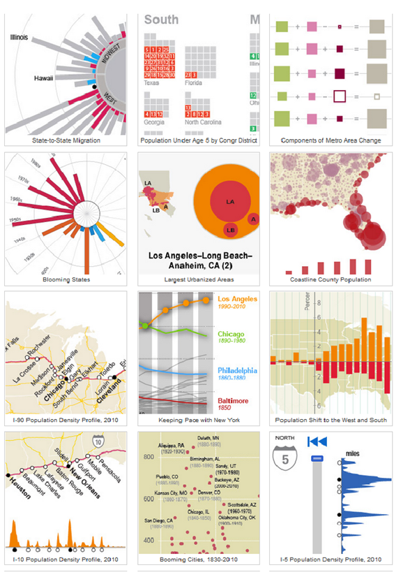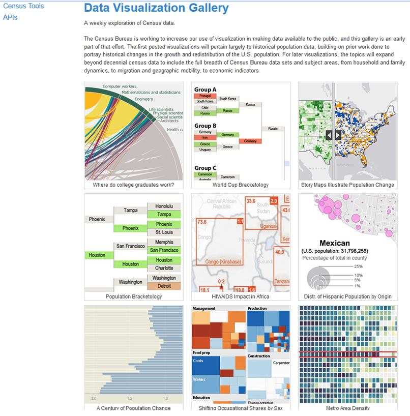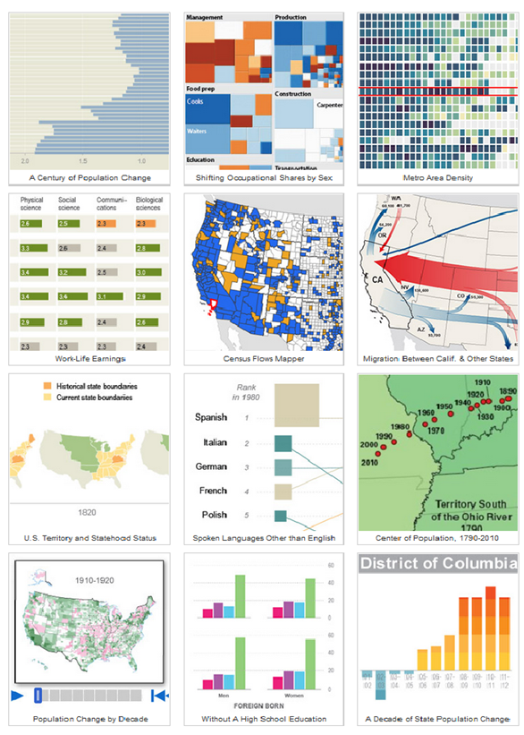 结合实际工作,我们有必要从现在起建立一个大数据可视化图示库,分科分类型搜集每一种图示并辅以实例。可以预见这个数据库必然会在经历一个最初的急剧膨胀期后缓慢扩大,最终慢慢稳定下来,而且沉淀的东西会非常有价值。美国人口调查局在此提供了一个很好的示范,它提供了各式各样和人口统计相关的可视化图形,如图三所示。