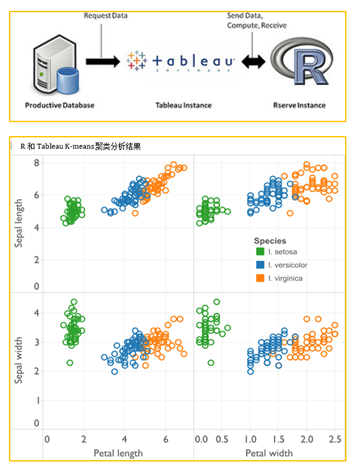 我们知道,大数据千变万化,各有特色,分析方法也相应不同,从而需要不同的可视化呈现。很多图形的呈现是取决于具体分析后得出的结果的.比如:依据不同统计方法 (K-means,bagging, boosting, random Forest) 产生的决策树图形, 生存分析结果产生的生存率曲线(Kaplan-meier curve)。统计学家,数据科学家,数据分析师,市场分析师等活跃在数据可视化第一线的专业人士,在现阶段仍旧需要调用多个不同软件进行复杂的数据分析,依据分析结果再进行作图。一般每个人都有一个或若干个惯用的软件。如果某个特定图形无法使用常规的数据分析软件生成的话,就不得不切换其他软件加以实现。随着大数据技术及市场日趋成熟,我们希望有一个整合的环境进行数据管理,数据分析,数据可视化,实现一体化(一条龙)分析,而不是疲于在各种不同软件系统间频繁的切换,费时费力且效率低下,还不利于他人验证整个数据生成及展示的过程。然而,如今离拥有一个涵盖所有数据管理分析,并同时满足视觉化需求的软件还很遥远。现阶段比较可行的是建立一个能整合融会大部分数据视觉化编程语言的平台。这样可以让使用者更快更便捷地进行数据管理,数据分析,及数据编程视觉化。Tableau 在这方面做着初步的尝试,比如开源统计软件R可以整合到Tableau里面,进行有限的数据分析后的图形视觉化处理呈现(图四),虽然过程仍然比较复杂(具体请见:使用R和Tableau 白皮书http://www.tableau.com/sites/default/files/media/using-r-and-tableau-software_0.pdf)。