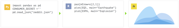 另一在此领域比较成功的例子是BEAKER数据科学家实验室。它提供了一个笔记本式可以切换使用各种编程语言(Python, R, JavaScript, Julia, Ruby等)的工作环境。让使用者在各种语言之间进行切换,或轻松添加新的编程块,确保始终使用对应性最强的工具进行合适的数据分析和可视化的实现。例如,通过Phyton到R到JavaScript的无缝编程,完成从数据操作到图形可视化的一体实现。如图五所示: