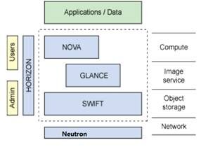 左侧是Horizon仪表盘,显示了一个可为用户和管理员用来管理OpenStack 服务的用户界面。Nova提供了一个可伸缩的计算平台,用来支持大量服务器和虚拟机的配置和管理。Swift实现一个具有内部冗余、可大量伸缩的对象存储系统。在底部的是Neutron,实现了网络连接即服务(networkconnectivity as a service)。最后,Glance项目为虚拟机磁盘映象实现了一个存储库(映像即服务(image as aservice))。
