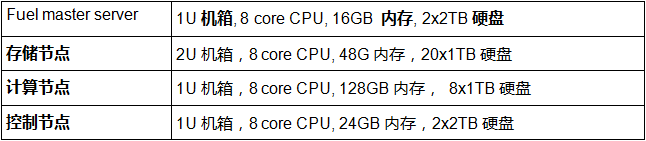 ·计算节点和存储节点需要大量的硬盘来存储用户数据,由于数量比较大,采购时可以考虑性价比较高的1TB硬盘。