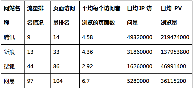 例:以下是腾讯、新浪、搜狐和网易的网站流量对比: