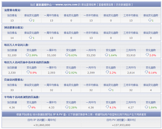Alexa排名(http://alexa.chinaz.com/)可以查询指定网站的全球排名、中国排名、页面访问量、平均每个访问者流量的页面等多个评价指标信息。