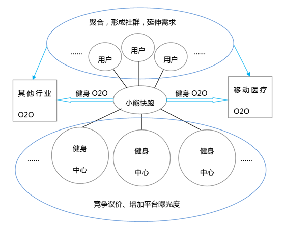 如果我们把健身房换成体检中心、美容中心、牙科诊所、高端医疗、甚至是医院呢?这就是移动医疗的O2O平台。将小熊快跑模式中的健身中心更换成体检中心,或者是高端连锁医疗机构,这就形成了无地域限制的远程、异地、多点服务的移动医疗O2O平台。