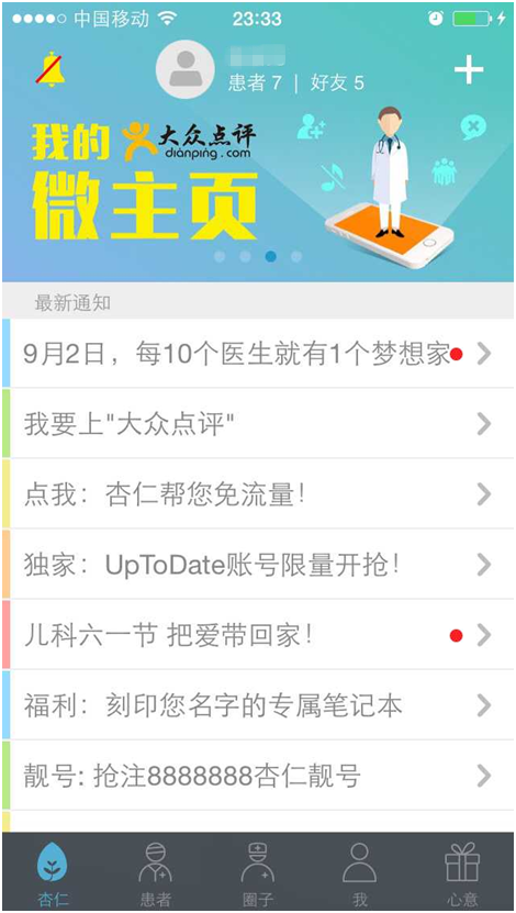 新版杏仁医生的产品首页(最新版V3.3.0更新于8月10号),首页新增功能“我要上“大众点评””,即医生通过杏仁医生将自己的杏仁号以及相关信息,提交至大众点评,从而获得更多的曝光度,引流陌生患者。