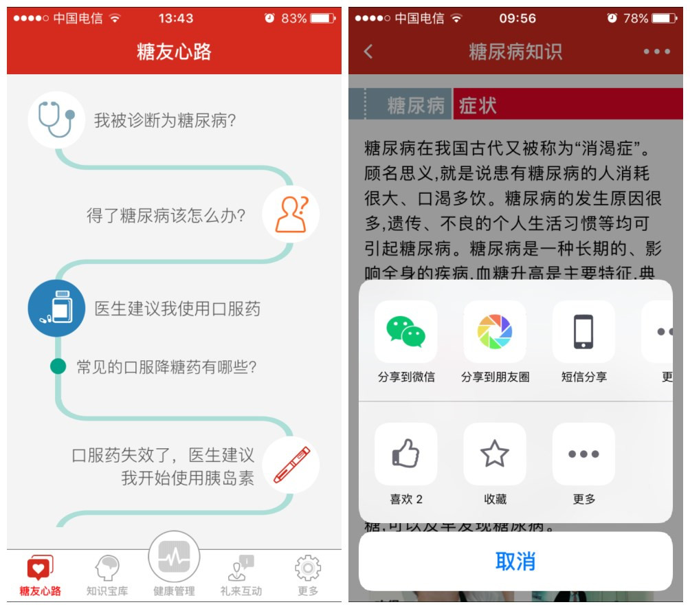 “糖尿病心天地”是由中国礼来公司推出的一款糖尿病管理移动应用程序。“糖尿病心天地”功能分五个模块:糖友心路、知识宝库、健康管理、礼来互动、更多。我是坚决反对离开产品去空谈模式的,那么接下来我们具体学习一下。