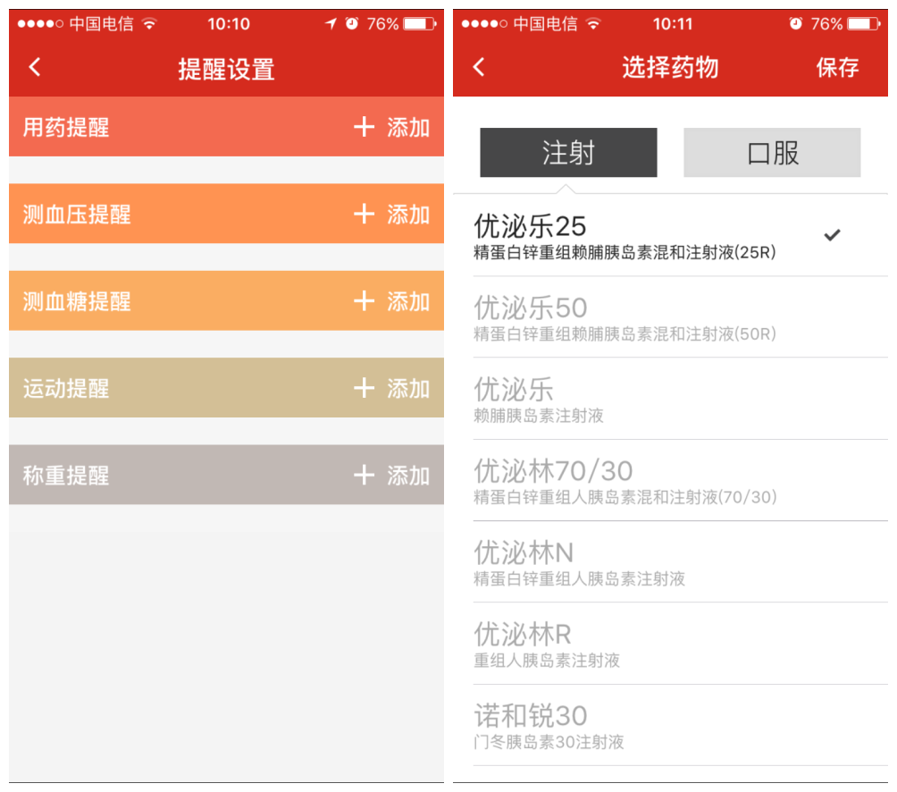 三、健康管理:①提醒设置:分别可以添加用药、测血压、测血糖、运动以及称重提醒。