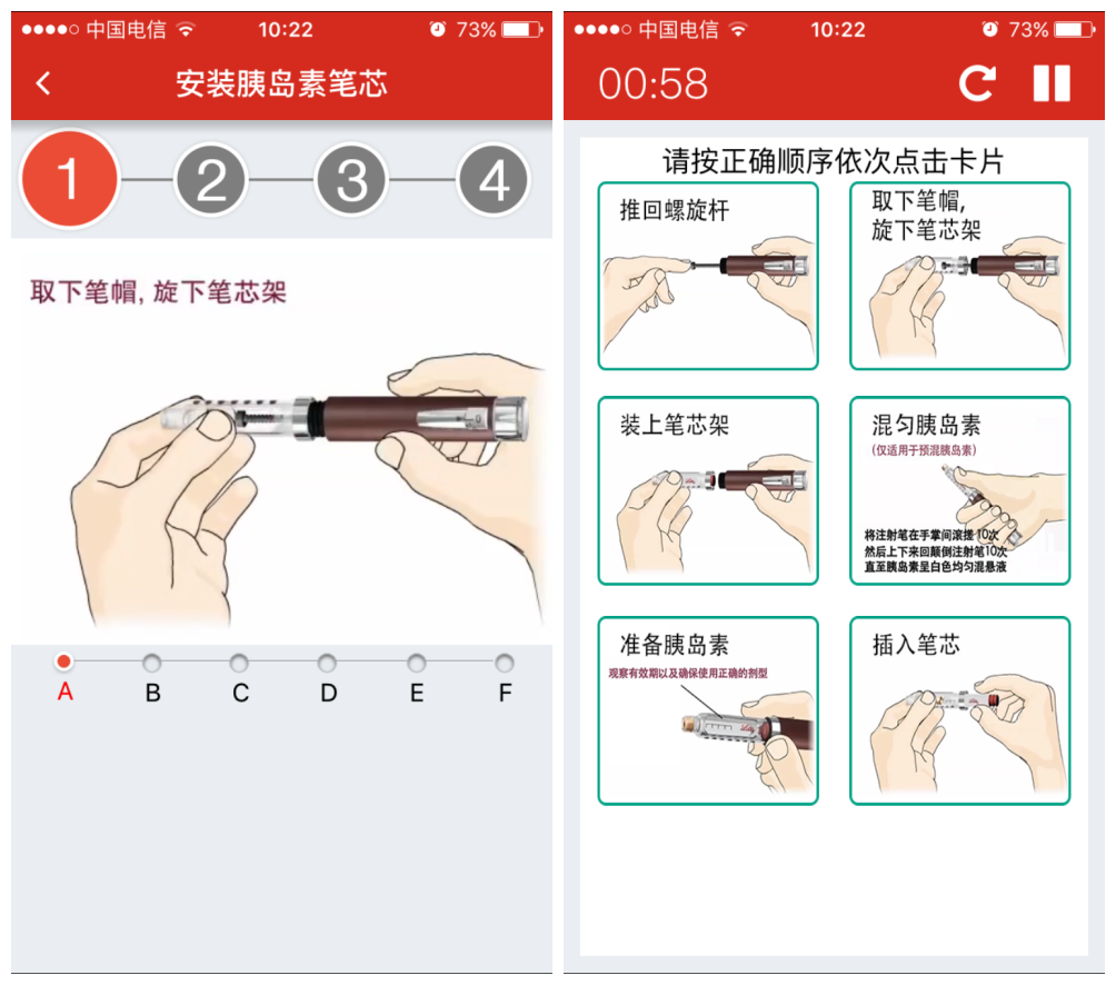 四、礼来互动:①礼来胰岛素笔、胰岛素笔游戏:动画演示胰岛素笔的使用方法,并将其做成选择卡片排序的小游戏。