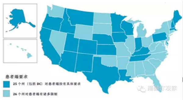 此外,至今为止只有24个州通过了Telemedicine Parity Law。远程医疗平等法要求私人医疗保险提供与面对面门诊等同的远程医疗报销方案。由此可见,美国至今仍有超过一半的州私人保险还没有跟上。在这24个已经通过了平等法的州中,各州的实际操作也大相迳庭,例如阿肯萨斯州要求在远程医疗之前医生和病人必须先有一次面对面的门诊。此外在尚未通过平等法的州中,康州和罗德岛甚至还没提供任何远程医疗的Medicaid保险。