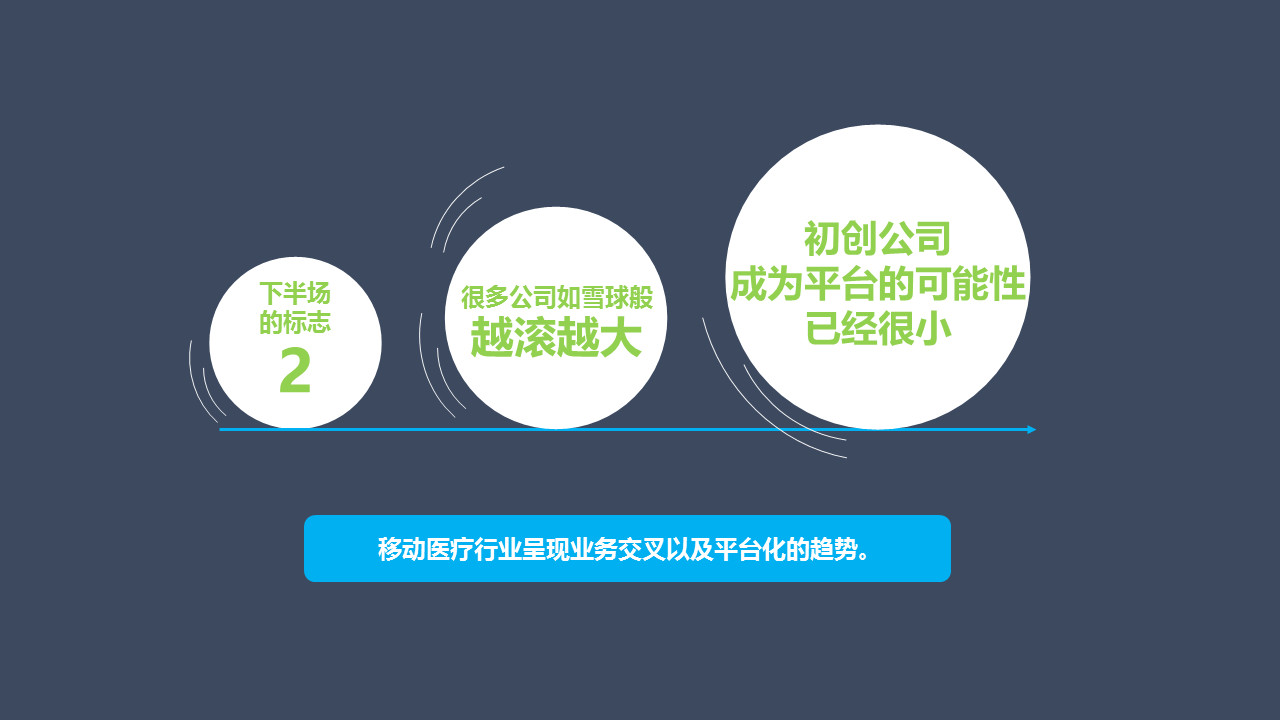 下半场标志2:移动医疗行业的业务越来越交叉,产品越来越呈现平台化,现有公司已经如雪球般开始越滚越大,因此留给初创公司成为平台的可能性已经很小了。
