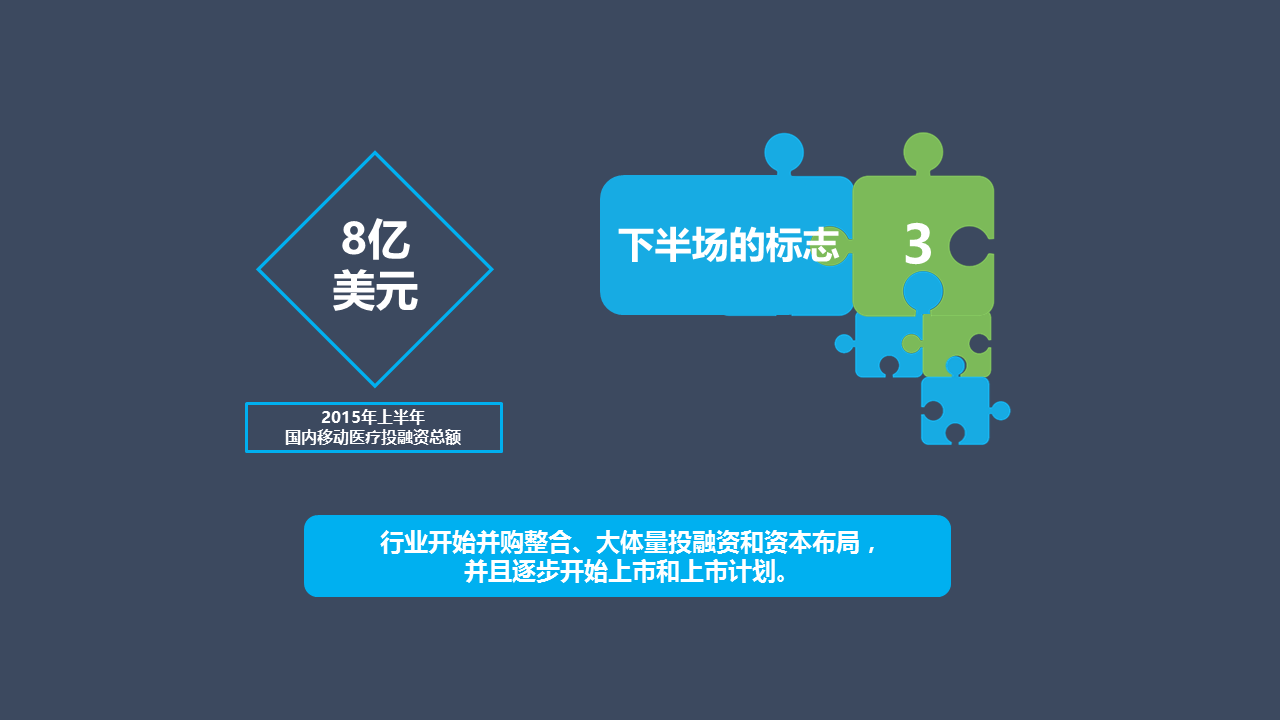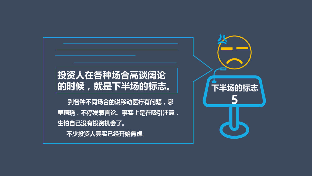下半场标志4:很多投资人害怕失去机会,于是就开始在各种场合进行高谈阔论,这其实标志着移动医疗下半场的出现。因为投资人已经开始焦虑,他们会说移动医疗这里哪里有问题,不停发表言论,这其实是在吸引注意力。