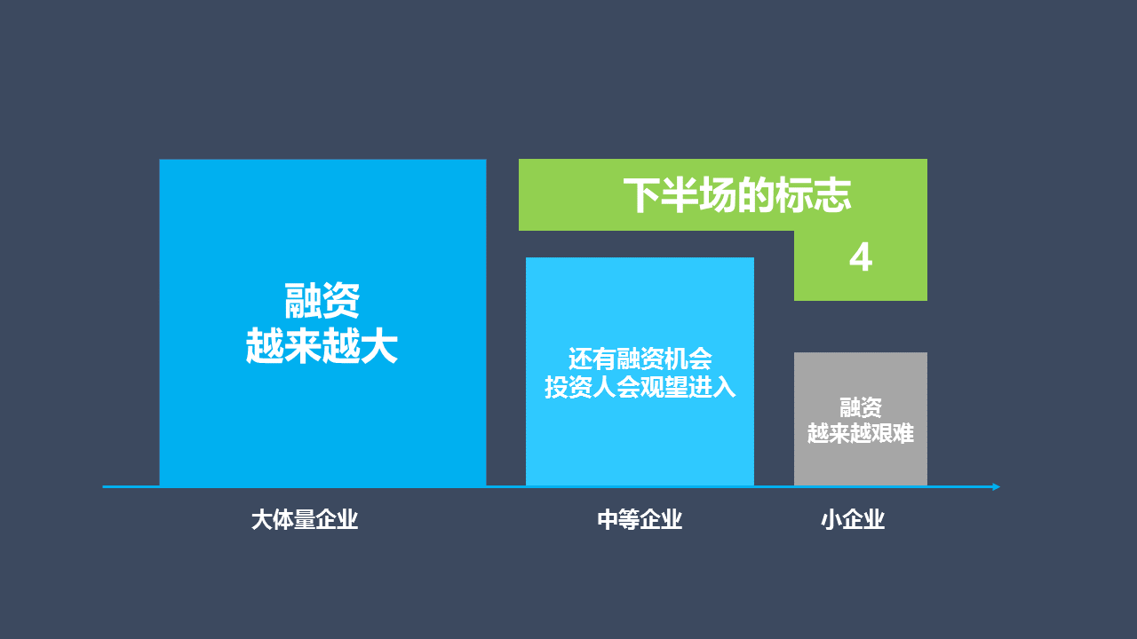 下半场标志3:行业开始了收购整合,并购基金开始进行投融资和资本布局,行业内的公司已经逐步开始上市和上市计划。大体量企业融资额越来越大,初创小团队融资越来越艰难,中间的团队还有融资机会,因为还有一些后来进入得到投资人想要“赌”一回。