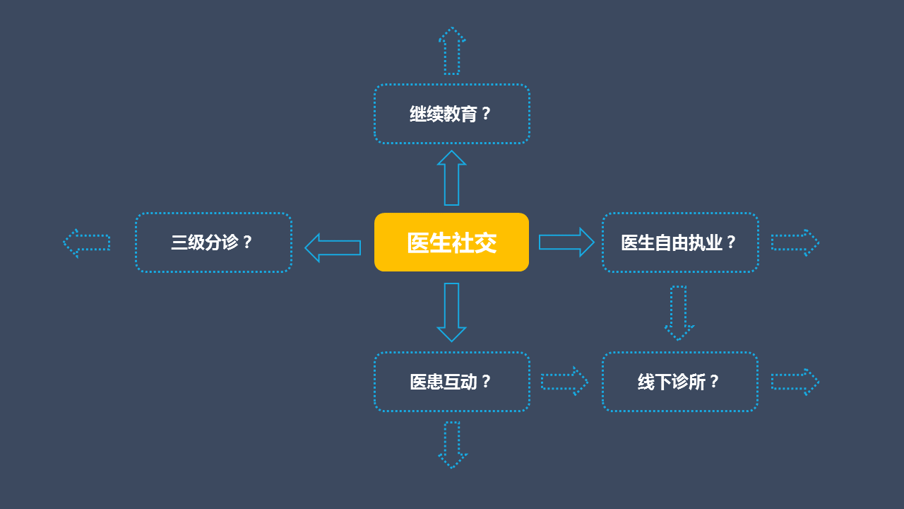 首先,比如说做医生社交的,随着用户体量的增加,它会不会去做三级分诊呢?之后会不会去做继续教育呢?三级分诊和继续教育做完后,它会不会去打造医生自由执业呢?未来会不会去做医患呢?做完医患后,未来会不会做线下诊所做O2O导流呢?这是一个路线图。