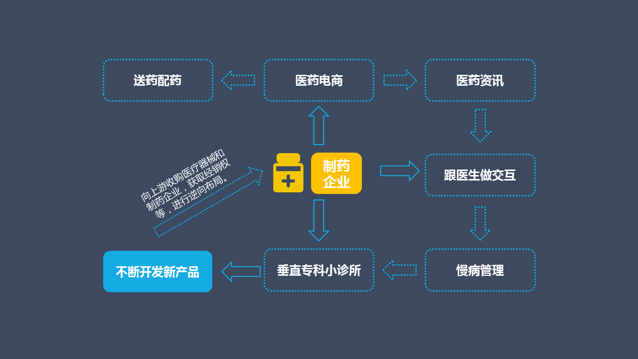 其次,如果从药企角度出发,它会先做医药电商,之后会不会做医药咨询呢?医药咨询会不会跟医生做交互呢?后面会不会做送药配药,慢性病管理呢?慢性病管理后会不会形成一个个垂直的专科,形成小的诊所呢?或者说由这些客户不断开发新产品,然后向上游去收购一些医药器械企业,获取经销权等,进行逆向布局呢?这是另一个线路图。