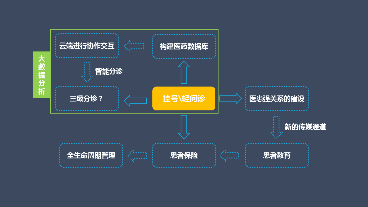 再者,如果从挂号轻问诊出发,流量多了之后会不会转向医患强关系的建设?建设完了之后形成新的传媒通道,会不会进行患者教育、保险和全生命周期的管理呢?未来会不会构建知识库,进行智能三级分诊,在云端进行协作交互,进行大数据分析,以此来延续平台的发展交互呢?