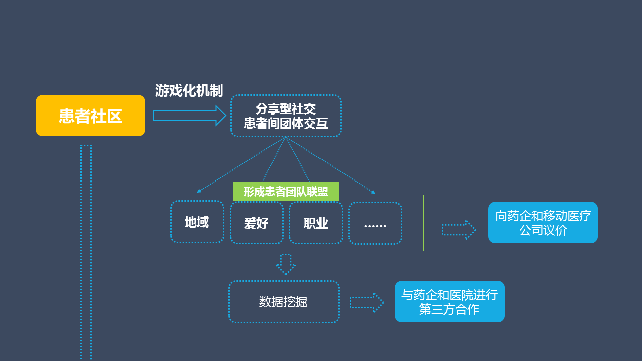 如果从患者社区出发,在患者社交之后,会不会形成游戏化机制,促进患者间的分享社交呢?患者之间按地域、年龄、爱好等因此进行分类后,可以构成小的团体进行交互。往下延伸之后,会不会形成联盟跟药企议价呢?形成独立联盟后,会不会跟药企和医院议价?会不会跟第三方企业进行合作呢?