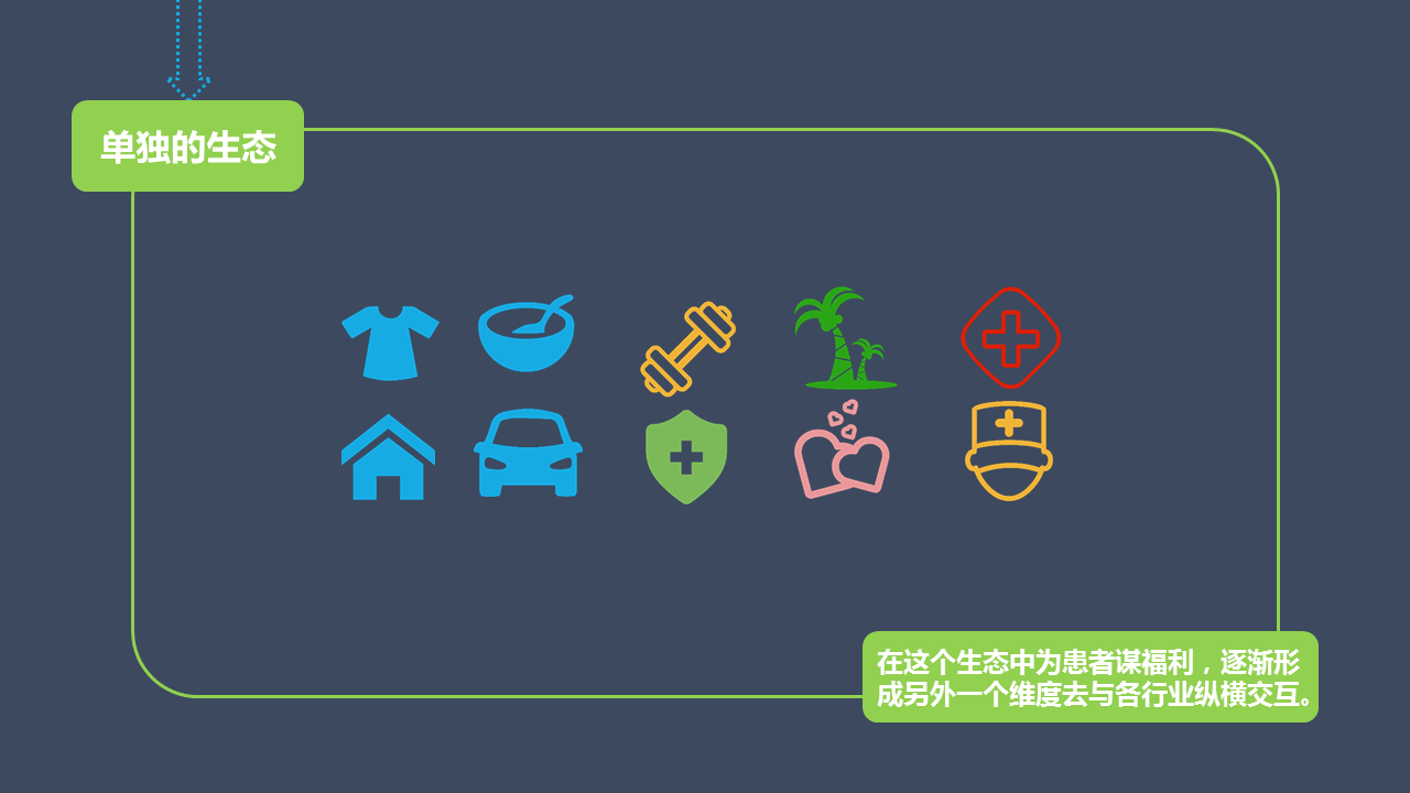 再往后,有没有可能形成一个单独的生态呢?当平台上聚集了越来越多的患者,可以给患者越来越多的福利。有没有对这批人群的衣食住行,生活诊疗,心理康复,保健,旅游等方面进行全方位的服务呢?这就可能会形成一个另外的维度与原先的患者社区平台进行纵横交互。