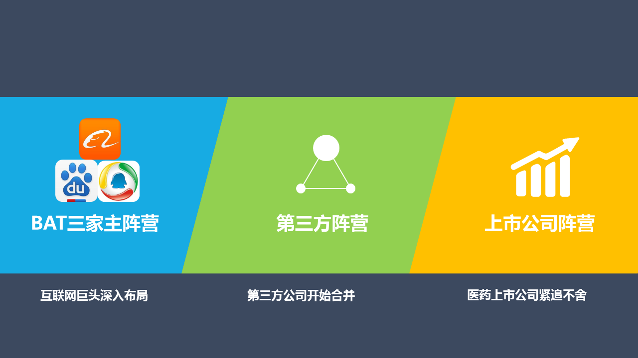 行业内还会进行一些大体量的并购,巨头之间也会进行合并,出现相爱相杀。移动医疗市场可能会分为三个阵营:第一个阵营由BAT等互联网公司形成的主阵营。第二个是上市公司小阵营。第三个是夹在中间的第三方的移动互联网公司阵营。