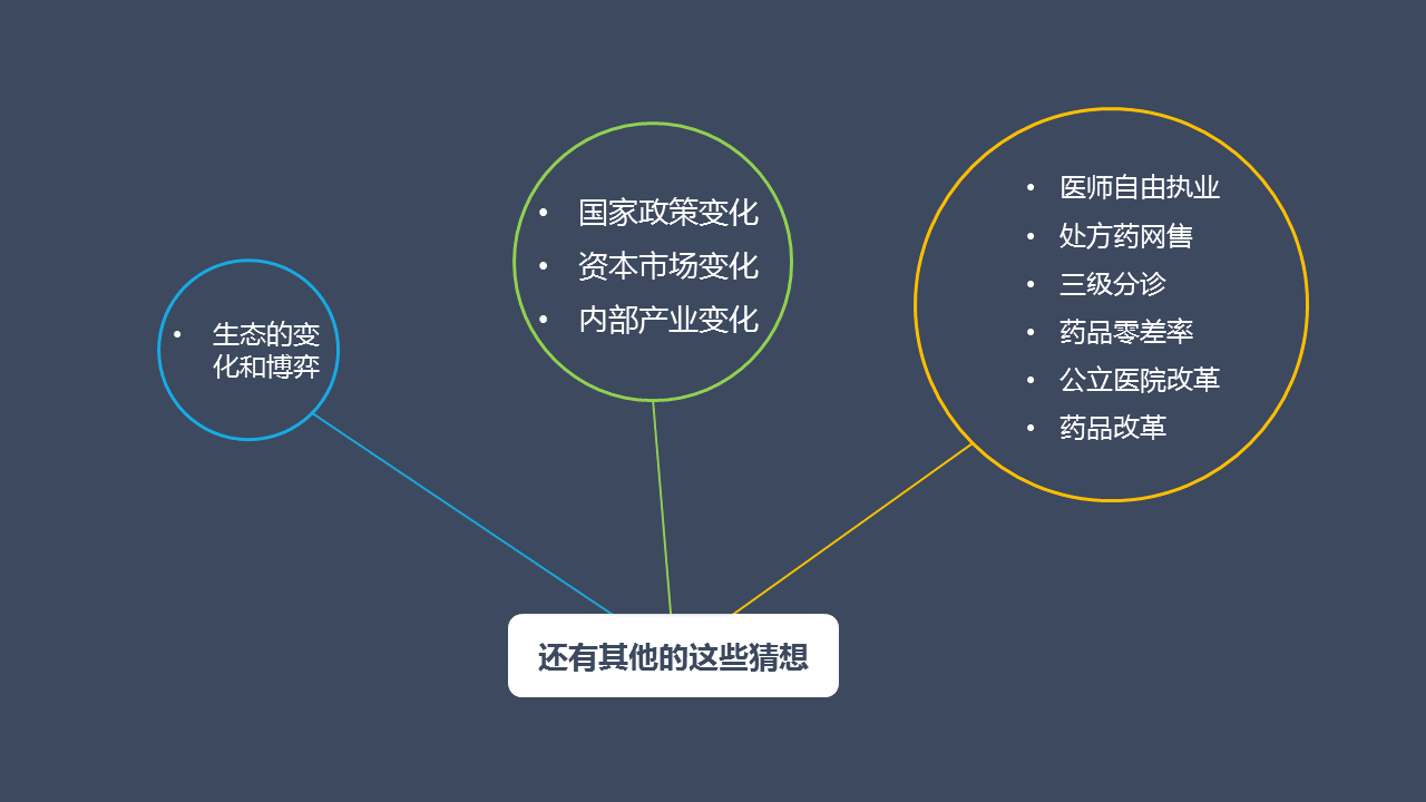 其次,还会有国家政策的变化,资本市场的变化,还有行业内部变化,譬如处方药网售,自由执业,药品零差率,三级分诊,公司医院改革等都会在未来影响着整个移动医疗行业的发展。