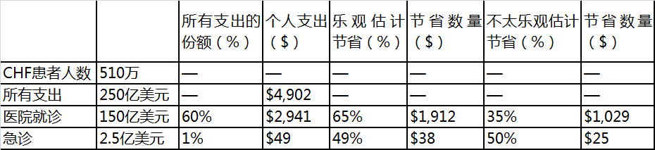 那么我们继续学习,德勤如何再次根据上文提到的CHF患者数据的进行分析(图4),结论是若成功进行远程医疗,一个包含150名CHF患者经ACO方案治疗的医疗系统每年可能节约80,000到147,000美元,假设储蓄率统一为50%且不考虑投资成本因素。医疗系统在全球按人计算模式下管理人口,对于这一特定人群采用基于远程医疗的互联医疗举措可能每年能够节省160,000到293,000美元。假设100%采用远程医疗,我们发现,每年可为美国CHF患者节省54.3-99.8亿美元。