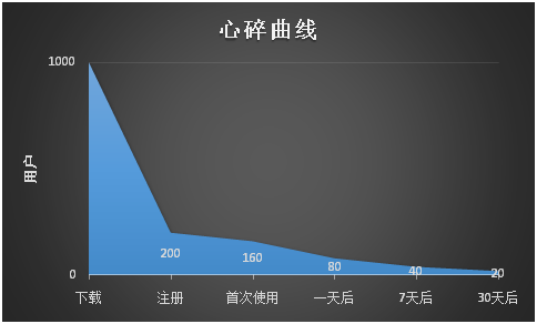 结果是,一个月后,你的APP的日活用户只有20个,这个曲线告诉我们一个残酷的事实,那就是你花了好大功夫吸引的用户,却在一个月后,怎么也留不住。这只是一个例子,虽然你的产品未必走同样的曲线。比如说微信,其显示出极高的转化率。但我们看到的大多数产品大概都是跟随者这条“心碎曲线”,不能独善其身。你认为你的产品比别人的更好吗?