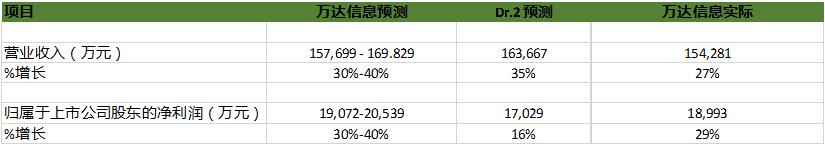 同比增长29.46%。我们曾经去年撰文发表在万达信息年报公布之前,对其2014年业绩进行以下分析和预测得出万达信息2014年营业收入可以达到其预期,但归属于上市公司股东的净利润则远没有预期那么理想。以下图表是万达信息对2014年业绩的预测,我们的预测以及万达信息2014年实际财务数据的比较:
