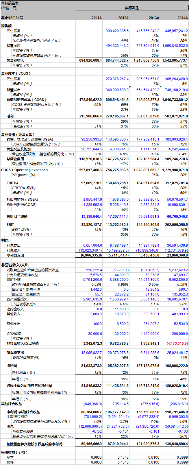 我们发现2011年,万达信息并没有按行业来划分营业收入,智慧城市收入在2013年和2014年,以惊人的速度增长(2013: