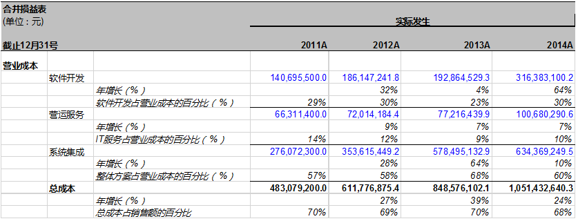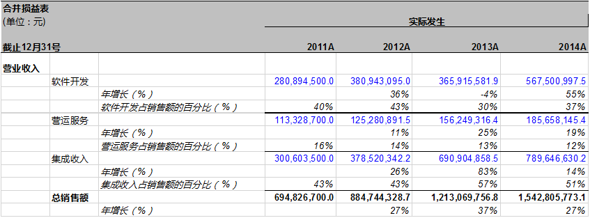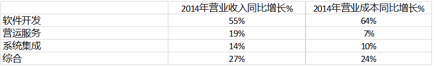 我们看到,2014年软件开发收入的同比增长达到55%,但是集成收入的增长同2013年相比,则急速放缓。营运服务的增长则保持相对平稳。集成收入占总营业收入的比例在2014年继续保持在50%以上,软件开发的收入虽然大幅增长,但其与营业收入的占比的提升并不明显。营运服务收入占营业收入的比重在稳定中逐年轻微下降。