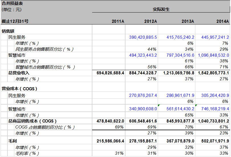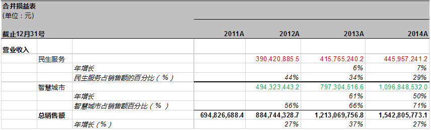 2014:50%)。2012年年度,智慧城市占总营业收入的比重超过了50%,到2014年已经上升到71%。而民生服务收入的比重则逐年递减(2012:44%;2013: