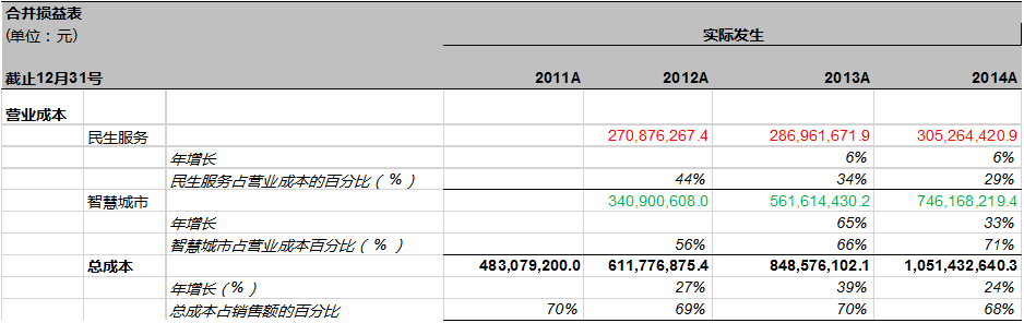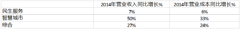 2014年,民生服务的营业成本占总营业成本的29%,和往年相比,智慧城市的占总营业成本的比重从2012年的56%上升到2014年的71%。