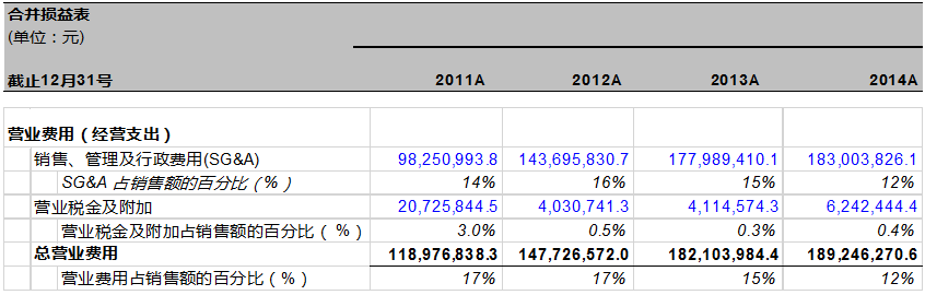 2014年,总营业成本占营业收入的比例为68%,较往年(2012:70%;2013:69%;2014:70%)略微下滑。