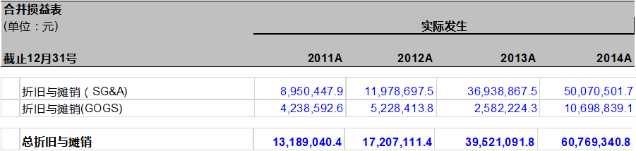 的下面,我们在各年度的年度报告里的管理费用一栏找到折旧与摊销的数据。如下图所示: