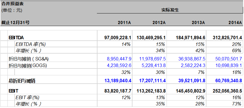 是利息,税,折旧和摊销前的利润),我们必须对上述营业成本做出调整。我们在这里需要将相关折旧和摊销从总营业成本里剔除。由于,万达信息年报里,