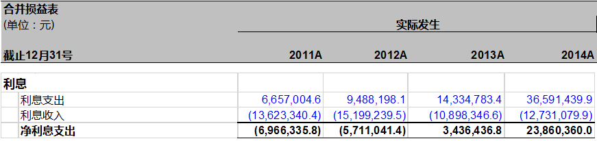 我们很容易地计算出利息费用净额:利息费用净额=利息支出-利息收入,如下图所示: