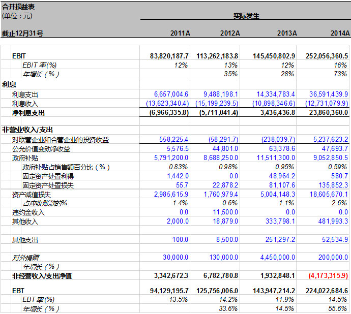 我们首先在巨潮咨询网下载万达信息过去四年的合并利润表。此表是严格按照我国会计准则要求的格式编制。由于会计准则不要求计算EBITDA和EBIT,我们花了一点功夫将过往4年的数据进行调整,然后重新组合并在一起。EBITDA和EBIT是一种利润衡量指标。目前国内的会计准则和上市公司财报披露指引,虽然没有强制规定上市公司必须披露EBITDA值,但根据公司财务报表中的数据和信息,投资者和分析员可以很容易计算出公司的EBITDA值。如下图所示: