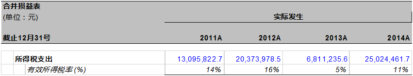 万达信息过去四年所支付的所得税以及实际发生所得税率为:如下图所示: