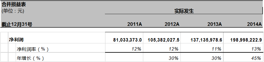 虽然万达信息2014年净利润率保持平稳,但同比增长为45%,与往年相比有大幅提升,这主要归功于营业成本和营业费用的增长大幅小于营业收入的增长。