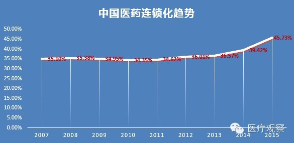药店连锁化的趋势在过去几年里越来越明显,2007年全国只有1,853家医药零售连锁企业,覆盖门店数121,070家,到2015年全国已有4,981家连锁企业,覆盖门店数448,057家。连锁企业覆盖门店数占总的药店门店数的百分比也由2007年的35.1%上升到2015年的45.73%。与此对应,美国的连锁化率大概在40%左右,67,000家药店里,差不多28,000家是连锁性质,大概50%左右是单体药店,剩下的10%左右属于大学、医院等(https://en.wikipedia.org/wiki/Pharmacies_in_the_United_States)。美国的连锁化率看似低,但集中化程度却相当高,最大的两家CVS和Walgreens大概占据了美国医药零售市场的75%左右份额,两家汇总起来就将近有2万多家连锁药店。通过不到1/3的药店数占有超过70%的市场份额,CVS和Walgreens的零售打法非常值得中国连锁学习,关于这两家公司我们在后续章节会有更多介绍。