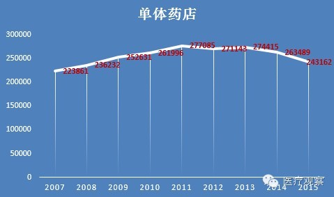 中国医药连锁化趋势变化中可以明显的看到从2014年和2015年相比往年有明显的加速连锁化趋势,这与2014年开始的移动医疗浪潮有着明显的关联性,在这个浪潮下资本对医药电商行业的追捧、对医药行业的追捧都加速了整个医药零售的连锁化趋势。与此相对应,在过去几年里单体药店数开始呈现下滑趋势,从2012年的最高峰271,143家已经下降到2015年的243,162家,下降了超过10%,这既与药店连锁化的趋势有关,也与2011年开始各地陆续发布有利于提高行业集约化的政策以及政府加大力度推进新版GSP认证有关,按照新GSP要求,每个药店必须匹配一名职业药师,但据执业药师认证中心数据,截至2015年6月30日,全国注册执业药师192,414人,仍然不足以满足药店终端的需求。