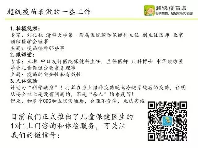而互联网似乎是将这几方面需求结合起来的最好途径。超级疫苗表是一个垂直的关注疫苗领域,尤其是儿童疫苗,提供疫苗健康教育,疫苗的提醒、医院的预约、社群、咨询医生,以疫苗为基础的儿童健康管理工具。“明明白白”是解决信息不对称的问题,满足客户对信息的需求;“轻轻松松”是指用户体验,用户可以通过APP预约,免受现场等待、小孩哭闹、交叉感染之苦。