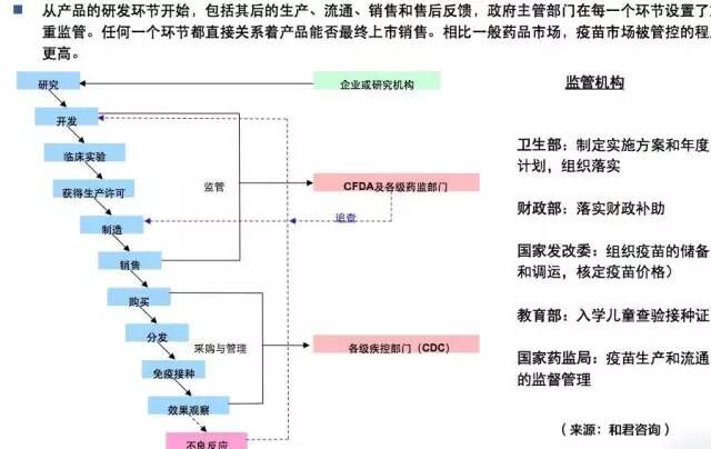 从产品的研发环节开始,包括其后的生产、流通、销售和售后反馈,政府主管部门在每一个环节都设置了严重监管。任何一个环节都直接关系着产品能否最终上市销售。相比一般药品市场,疫苗市场被管控的程度更高。